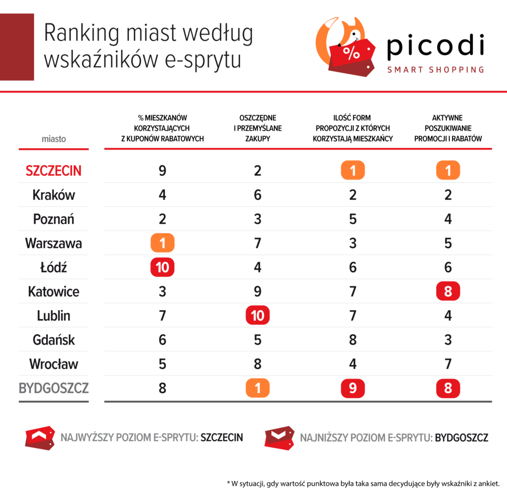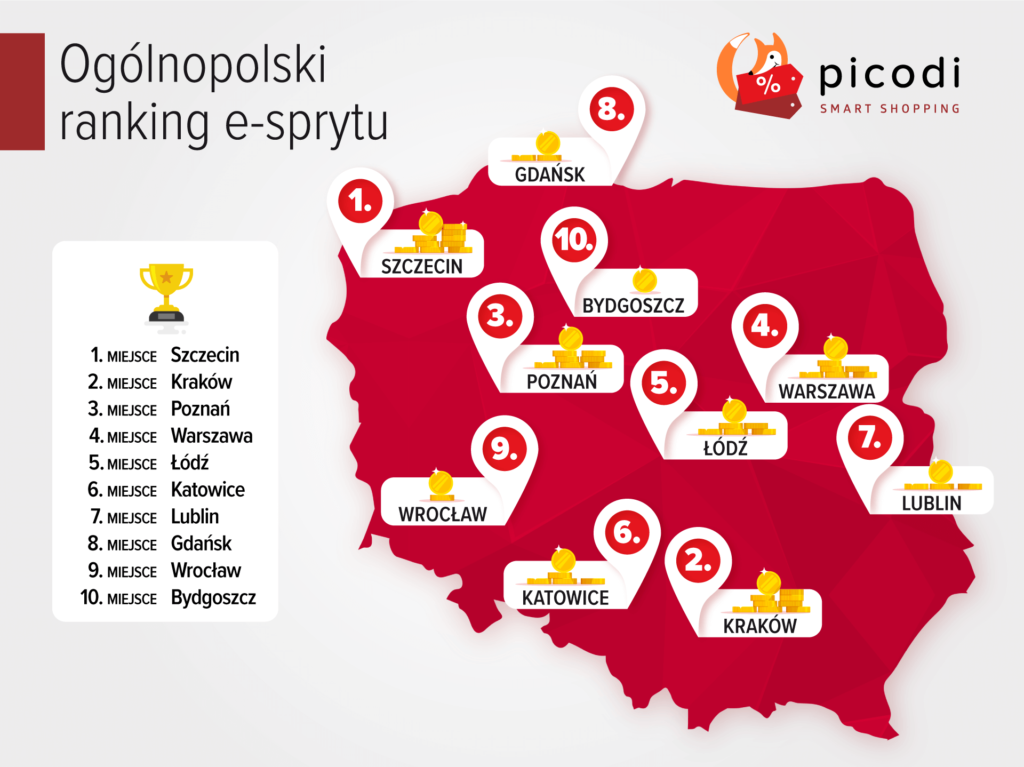 Polską stolicą łowców okazji okazał się Szczecin, gdzie blisko siedmiu na dziesięciu badanych przynajmniej kilka razy w roku przeczesuje internet w poszukiwaniu specjalnych okazji. Co ciekawe, tuż za nim w rankingu e-sprytu uplasowały się Kraków oraz Poznań, których mieszkańcy często spotykają się z opinią „centusiów” i skner. Najgorzej w rankingu wypadła Bydgoszcz, gdzie mieszkańcy kupują niewiele i bardzo rzadko korzystają z promocji (choć nie można im odmówić wyjątkowo rozważnych i ostrożnych decyzji).
