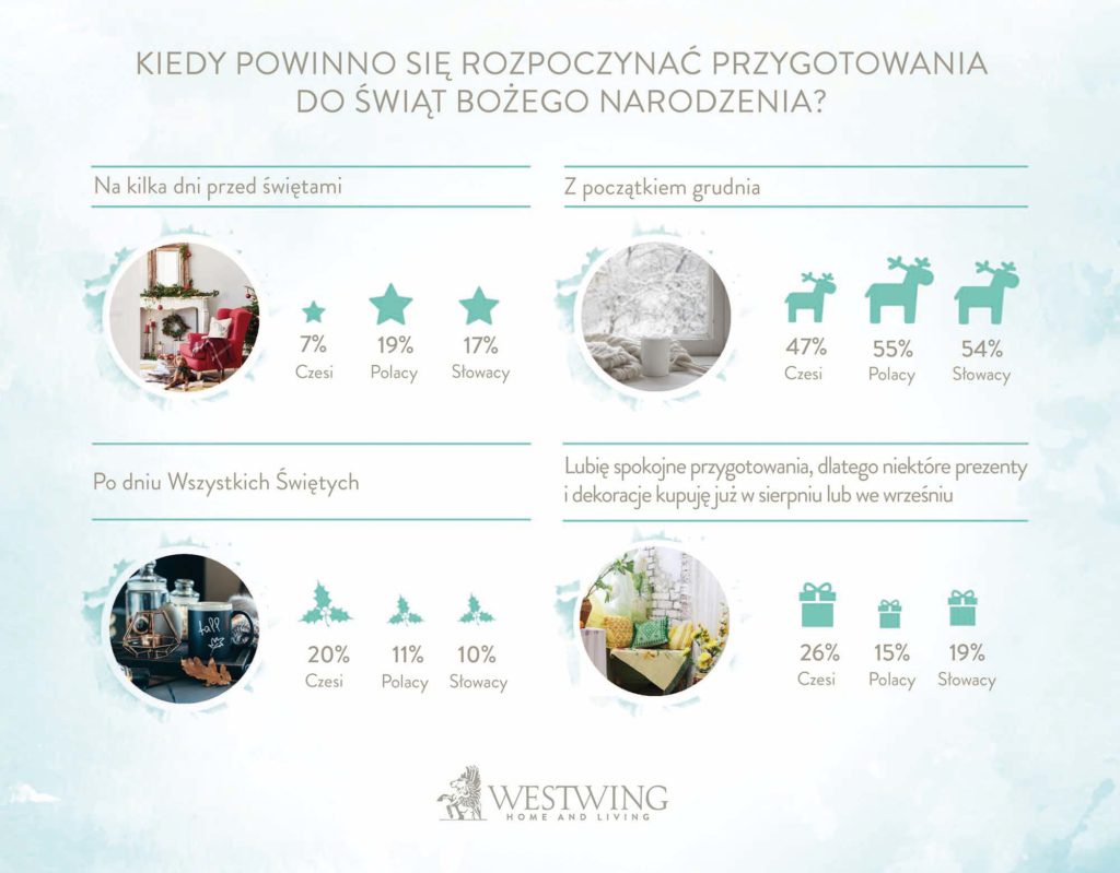 Jak wynika z badania przeprowadzonego przez Westwing Home & Living, świąteczny nastrój u większości Polaków, Czechów i Słowaków pojawia się wraz z początkiem adwentu lub zaraz po Mikołajkach. Co ciekawe, najwcześniej udziela się on ludziom młodym – 43% Czechów, 27% Słowaków i 23% Polaków, poniżej 25. roku życia, przyznało, że świąteczny nastrój ogarnia ich już na początku listopada. Wraz z wiekiem wzrasta liczba osób, u których pojawia się on dopiero w święta lub na kilka dni przed. Najmniej takich osób znajdziemy w Czechach – taką odpowiedź zaznaczyło tam tylko 14% ankietowanych, podczas gdy na Słowacji – 24%, a w Polsce – 30%.