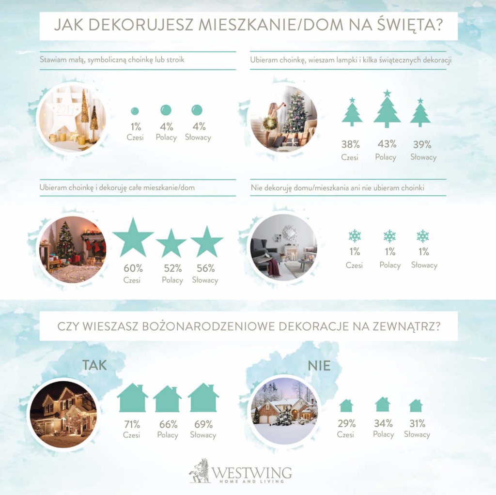 Ponad połowa respondentów we wszystkich trzech krajach dekoruje na święta całe mieszkanie lub dom. Największą wagę do świątecznych dekoracji przykładają Czesi. Aż 60% badanych przystraja