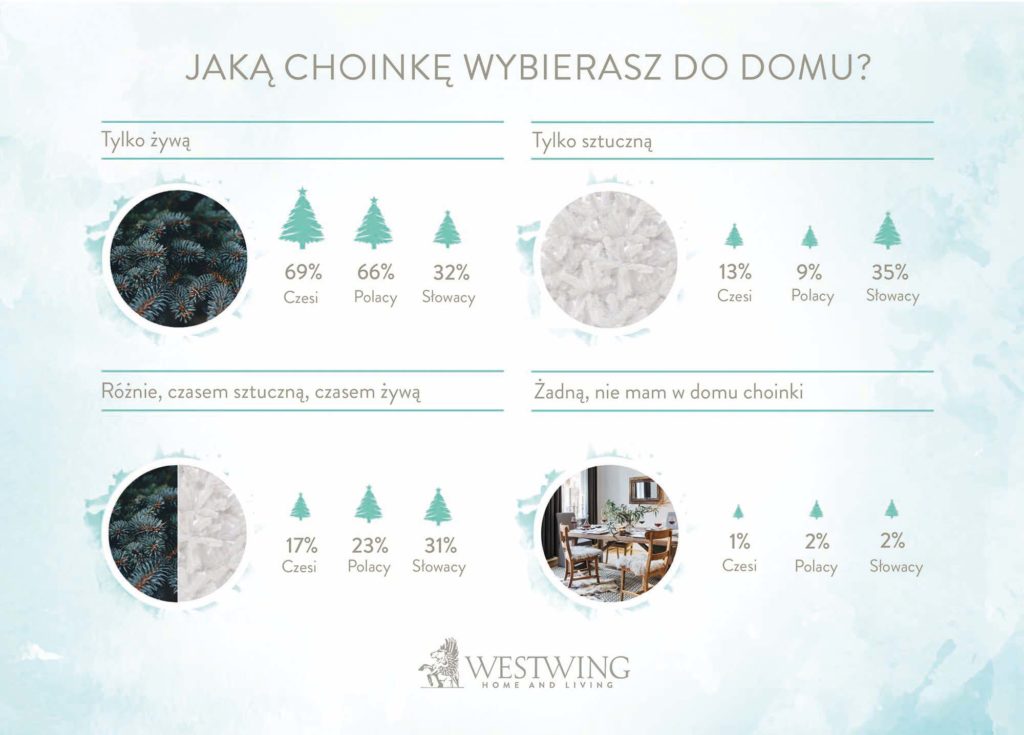 Na koniec kwestia, która od lat wzbudza najwięcej emocji: choinka sztuczna czy żywa? Otóż dla 66% Polaków i 69% Czechów – tylko żywa! Z kolei wśród Słowaków zdecydowanie większą popularnością cieszy się choinka sztuczna – co roku decyduje się na nią aż 35% respondentów, a prawie 1/3 mieszkańców tego kraju nie przywiązuje większej wagi do rodzaju świątecznego drzewka.
